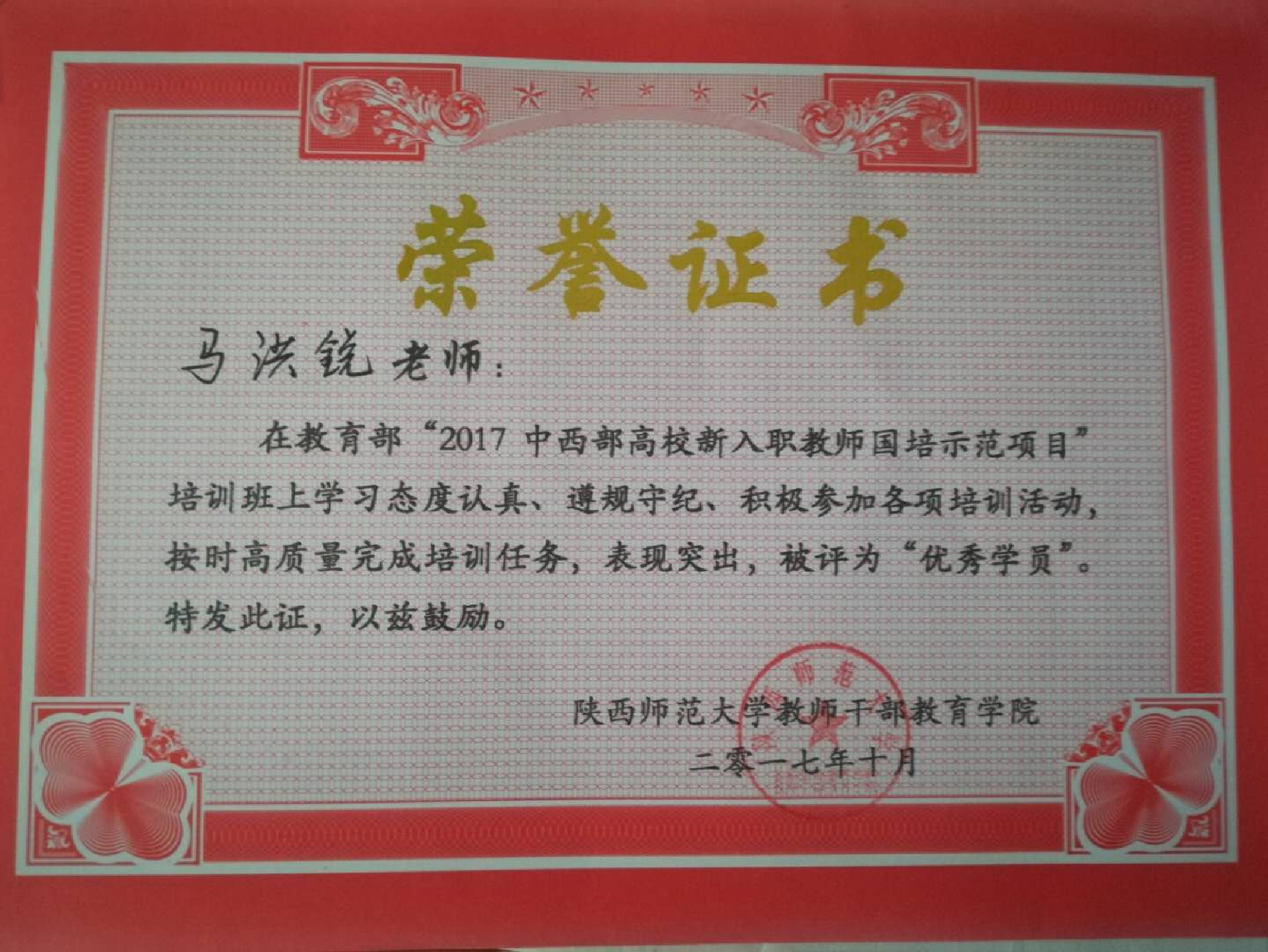 马洪锐博士“教育部2017中西部高校新入职教师国培示范项目”培训喜获“优秀学员”奖